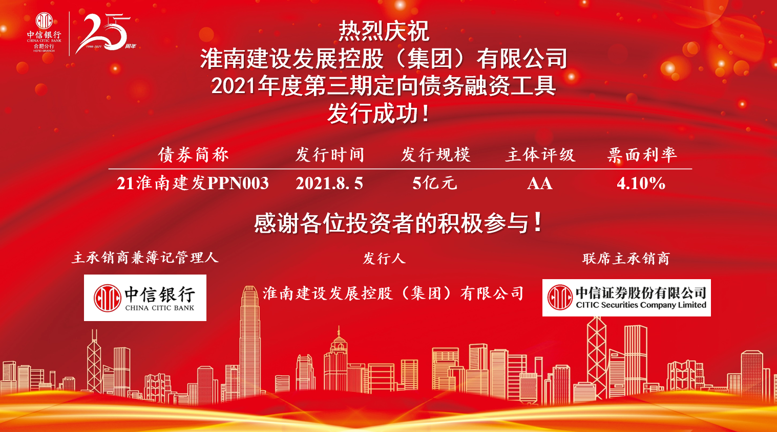 8月5日,淮南建設(shè)發(fā)展控股(集團)有限公司2021年度第三期定向債務(wù)融資工具(PPN)5億元成功發(fā)行,期限1年,票面利率4.1%。發(fā)行過程中,我公司克服困難,拓展市場,聯(lián)系債券承銷商中信銀行、中信證券,與投資者多次進行溝通,保障本期債券成功發(fā)行,票面利率在同業(yè)中處于較好水平。